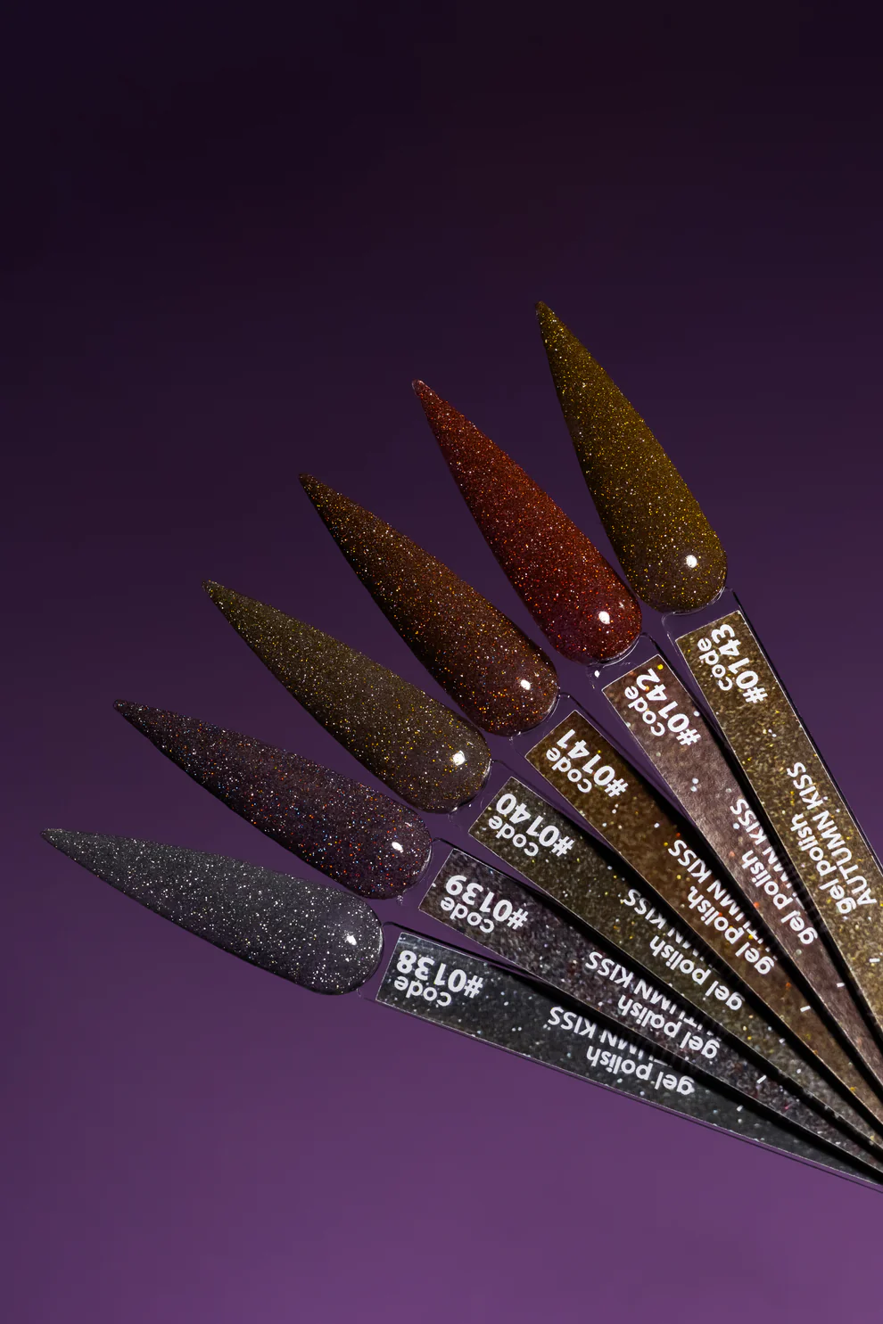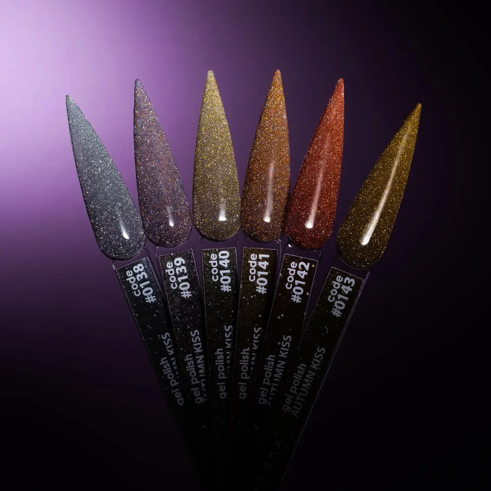 La colección “Autumn Kiss” es una serie de tonos translúcidos que reflejan la luz. Los esmaltes en gel de esta colección presentan una fórmula de consistencia media, enriquecida con destellos y cristales de efecto “flash” que reflejan la luz. Los tonos de la colección se pueden usar por sí solos para un manicure minimalista y elegante o combinar entre sí paonales. También son un complemento perfecto para realzar colores de base.ra lograr efectos más profundos y multidimensi
